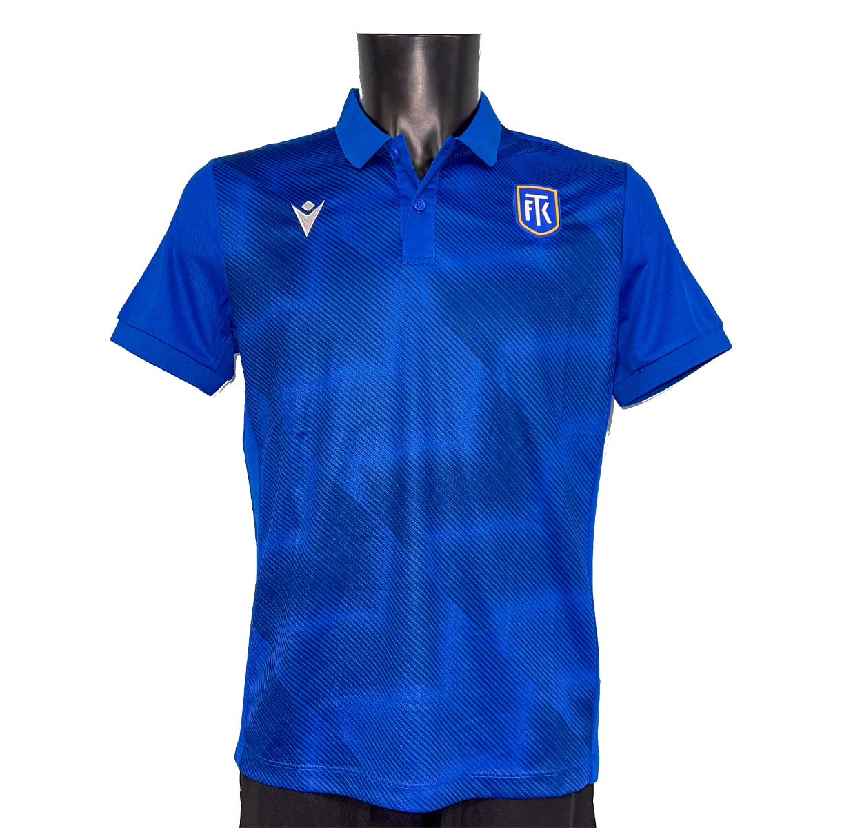 Modré tričko s límečkem Macron s gumovým jednobarevným logem klubu. 100% polyester.
